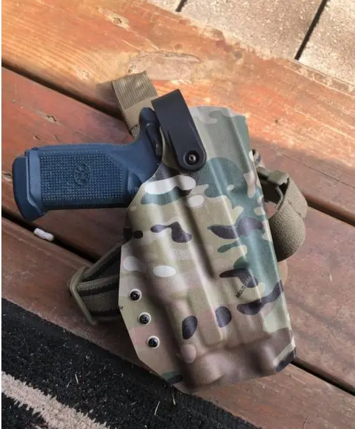 The Shire Drop Leg Rig is our offering for those who need a rugged solution for tactical use while using body armor or ease of carry for a larger gun during hunting or other activities. The Shire Drop Leg rig uses the G-Code RTI hanger system which allows for the holster portion of the drop leg rig to be removed from the leg drop and attached to a myriad of other RTI carry solutions such as a drop and offset for duty carry, a chest rig mount, a belt slide, and many others. This holster style also allows for a level 2 spring loaded hood that allows for additional retention and safety for your pistol during carry. It is available in many colors of kydex and for a large range of full size pistols.